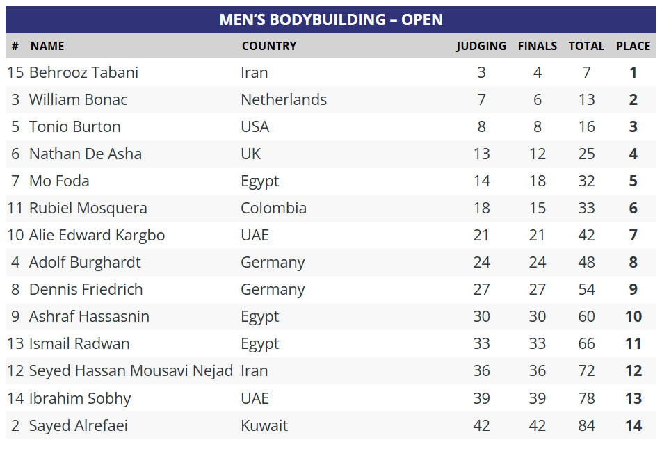 Am Ende kam es – wie schon im Vorjahr – zu einem Zweikampf zwischen Behrooz Tabani und William Bonac, den erneut der Iraner für sich entscheiden konnte. Für Tabani bedeutete dies nicht nur seinen fünften Profisieg, sondern auch seine dritte Olympia-Qualifikation. Ob er diese angesichts der aktuellen geopolitischen Lage wird wahrnehmen können, bleibt offen.